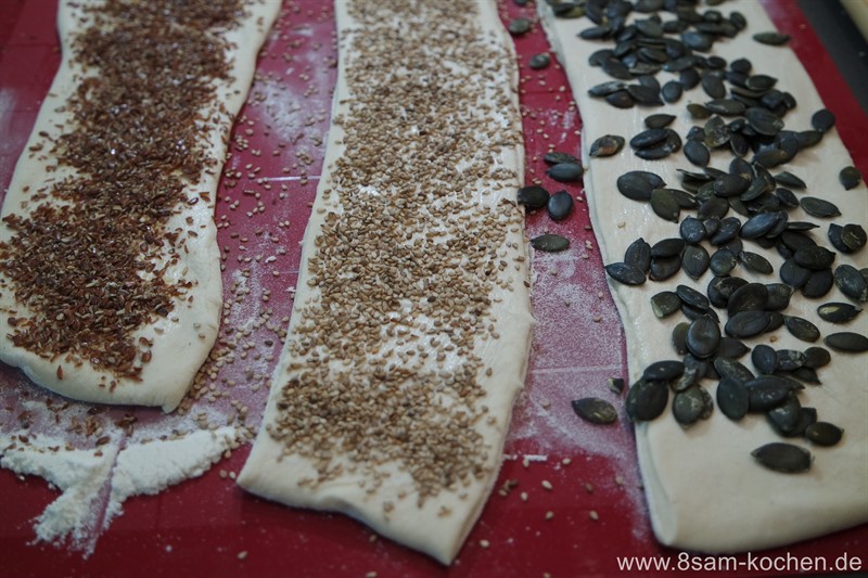 Wasser, Hefe und Honig miteinander vermischen und zur Seite stellen. Die trockenen Zutaten vermengen und mit der Wassermischung ca. 10 Minuten zu einem geschmeidigen Teig kneten. Den Teig auf einer bemehlten Arbeitsfläche zu einem Rechteck ausrollen, in drei gleichgroße Streifen schneiden, nach und nach erst dünn mit Wasser einstreichen und dann mit einer Sorte Kerne bestreuen.