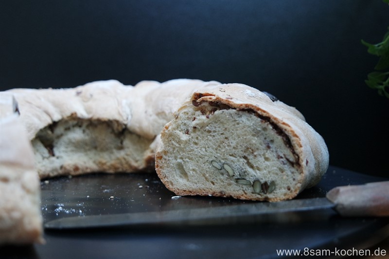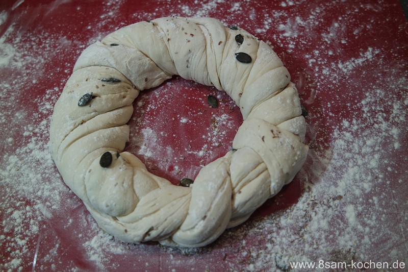 Wenn alle Teigstreifen mit den Kernen bestreut sind diese erst in sich selbst verdrehen (twistern) und danach umeinander. Den entstandene Wirbel abschließend zu einem Kranz formen und auf dem Backblech, abgedeckt an einem warmen Ort, 30 Minuten ruhen lassen.