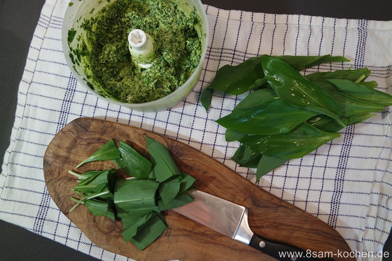 Bärlauch waschen, trocknen (geht am besten in einer Salatschleuder), in feine Streifen scheiden, mit dem Salz im Mixer pürieren und mit der Butter vermengen.