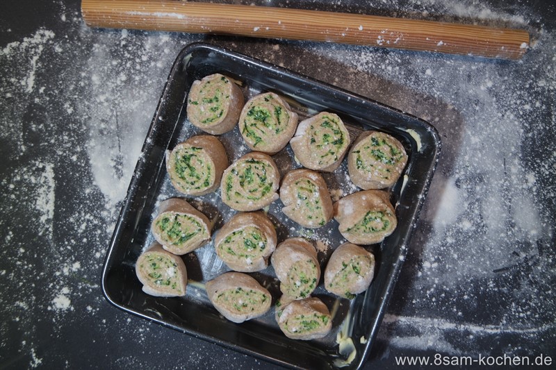 Den Teig durchkneten, zu einem Rechteck ausrollen (ca. 20 x 30 cm) und mit der Bärlauchbutter bestreichen, aufrollen, in ca. 4 cm dicke Scheiben schneiden, in eine gefettete Form legen und weitere 30 Minuten ruhen lassen.
