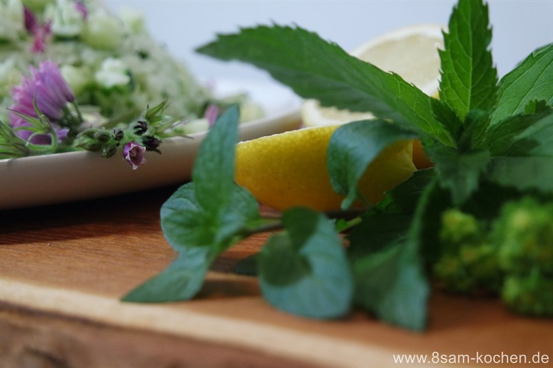1 große und 1 kleine Schüssel – scharfes Messer – Messbecher – Brettchen – Zitronenpresse – Pürierstab – Topf – Sieb
