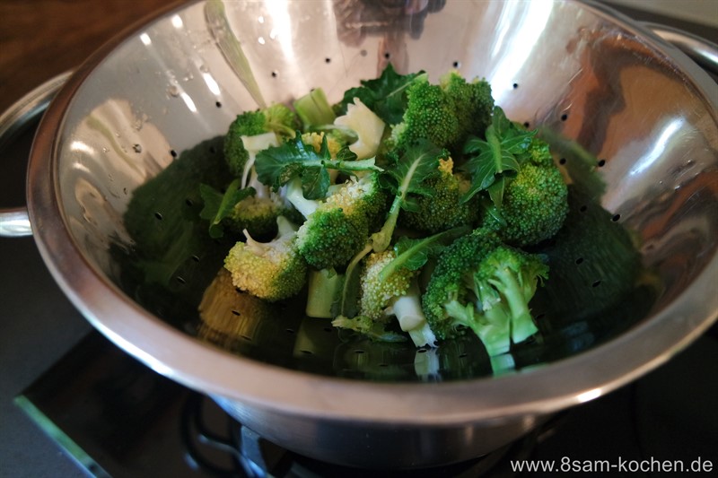 Den Brokkoli anhand der Röschen zerteilen, die dickeren Röschen unten kreuzweise einritzen, den Strunk und Stiele in Würfel schneiden und alles säubern. Den Brokkoli in das Sieb geben, den Boden des Topfes mit ca. 2 cm Wasser bedecken und zum Kochen bringen. Das Sieb auf den Topf setzen und den Deckel über das Gemüse geben. Den Brokkoli ca. 10 min. über dem Dampf garen bis er weich, aber noch bissfest ist. Den Brokkoli kalt abspülen und zur Seite stellen.