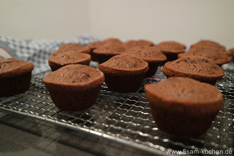 Die weiche Butter mit den Zuckern schaumig schlagen, die beiden Eier zufügen und weiter schlagen, bis eine schöne fluffige Masse entstanden ist, am Ende wird noch die saure Sahne untergerührt. Nun die Mehlmischung und die Schokolade unter die Masse heben und alles gut miteinander vermengen. Im Anschluss den fertigen Teig in den Spritzbeutel oder den Gefrierbeutel füllen und so in die Formen spritzen, das sie zu 2/3 gefüllt sind. Du kannst auch einen Löffel zum Verteilen des Teiges nehmen. Sauberer und einfacher geht es mit einem Spritzbeutel. Wenn Du keinen Spritzbeutel hast, nimm einfache einen Gefrierbeutel und schneide ein kleines Loch in eine der Spitzen.
