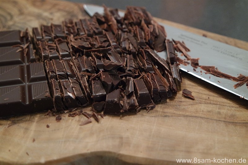 Die Butter raus stellen, damit sie Zimmertemperatur annehmen kann. In der Zwischenzeit die 100 g Schokolade in feine Stücke hacken und zur Seite stellen. 250 g Mehl abwiegen und mit dem Natron, 2 gehäuften Esslöffeln Kakaopulver und einem Teelöffel Zimt gut vermengen. Die Muffin-Formen einfetten und zu Seite stellen.