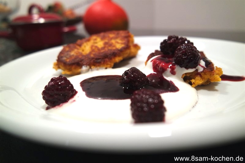 Kürbispuffer mit Brombeeren und Ziegenfrischkäse