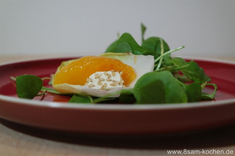 Dieser Wintersalat liefert Dir Geschmack und Vitalstoffe für Dein Immunsystem. Chicorée und Postelein oder Winterportulak gehören zu den klassischen Wintersalaten. Während Postelein durch seine leichte Säure und sein nussiges Aroma besticht und so als Grundlage für viele Salate dient, bietet sich der Chicorée mit seiner leicht bitteren Note und seinem knackigen Biss gerade zu zur Kombination mit den süßen karamellisierten Orangen und dem cremigen Schafskäse an. Dieser Wintersalat ist ein echtes Kraftpaket und liefern neben Vitamin C, Vitamin A, Niacin und andere Vitamine. Im Zusammenspiel mit den Orangen und dem Sesam liefert Dir dieser Salat eine gute Portion Vitamine und Mineralstoffe. Einem ausgeglichenen, ruhigen und entspanntem Tag steht somit nichts mehr im Weg.