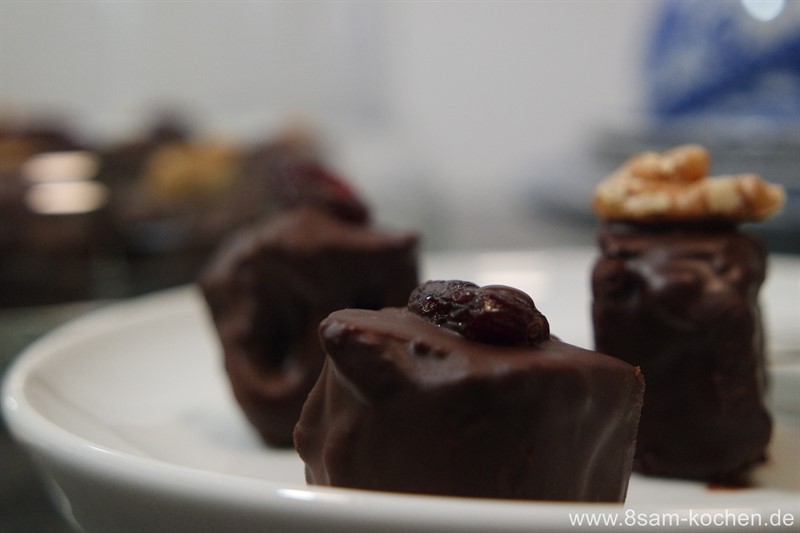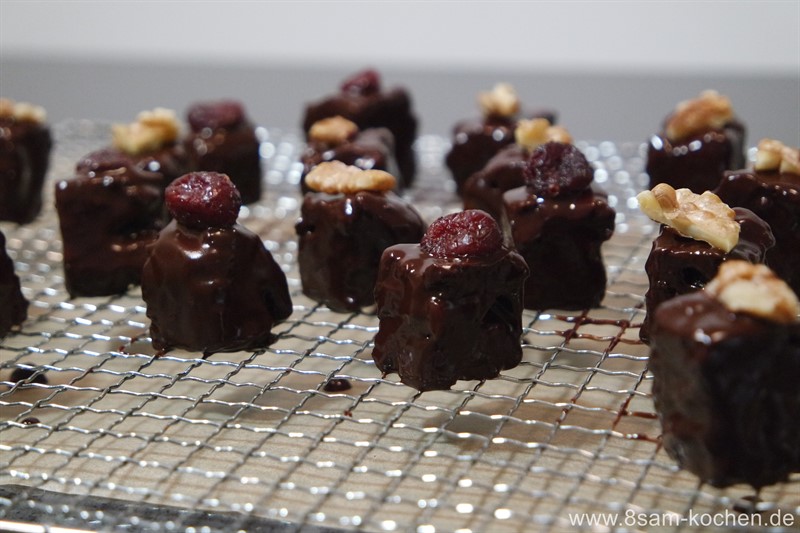 Die Schokolade in kleine Stücke brechen und mit den anderen Zutaten über dem Wasserbad schmelzen. Nun immer ein Würfel kopfüber in die Schokolade geben, mit der Gabel umdrehen, raus heben und leicht abtropfen lassen. Das geht am besten in dem Du die Gabel vorsichtig auf den Rand schlägst. Den glasierten Würfel auf ein Gitter legen, mit einem Stück Walnuss oder einer Cranberry verzieren und auskühlen lassen.