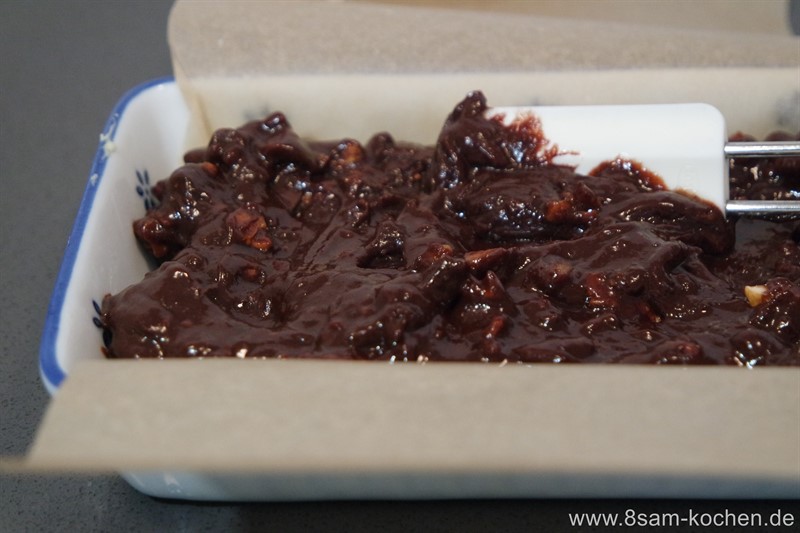 Die Butter in einem Topf zum Schmelzen bringen und mit dem Zucker und einem Esslöffel Ahornsirup verrühren. Die Masse zur Seite stellen und die Schokolade, die Nüsse und die Cranberries in kleine Stücke hacken und ebenfalls zur Seite stellen. Das Ei in die abgekühlte Butter-Zuckermasse rühren, Mehl, Kakaopulver, 1 Prise Salz und etwas Vanille mit einander vermengen und mit den gehackten Nüssen, der Schokolade und den Cranberries in die Masse rühren. Den Teig in die mit Backpapier ausgelegte Form geben und bei 175 °C ca. 15 – 20 min. backen. Damit Du später kleine mundgerechte Happen schneiden kannst, sollte der Teig die Form nicht mehr als 2 cm hoch ausfüllen. Den fertigen Kuchen aus dem Ofen nehmen, abkühlen lassen und mit einem scharfen Messer in mundgerechte Happen schneiden.